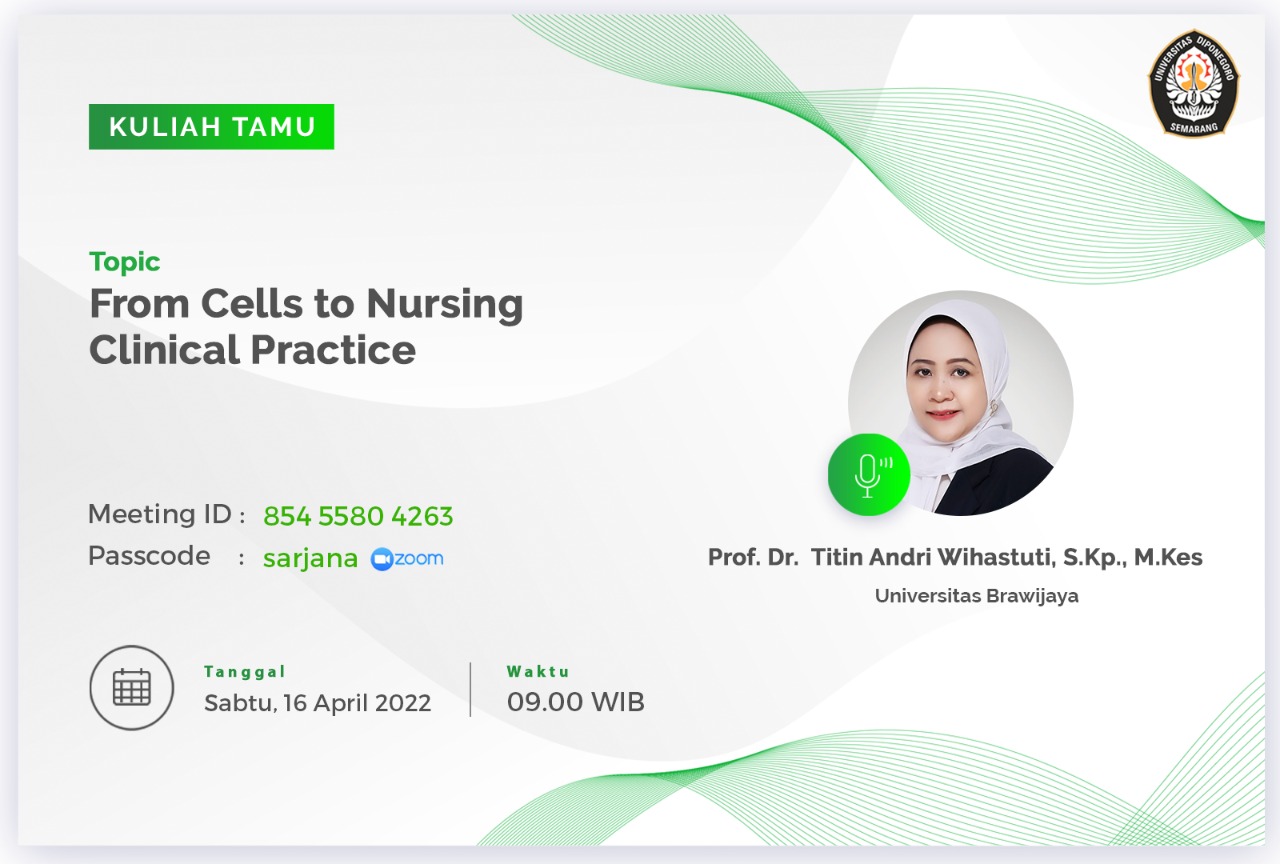 Semarang – The Bachelor of Nursing Study Program of the Department of Nursing, Faculty of Medicine, Undip will hold a guest lecture for the even semester of the 2021/2022 academic year on April 16, 2022 at 09.00 WIB via Zoom media.