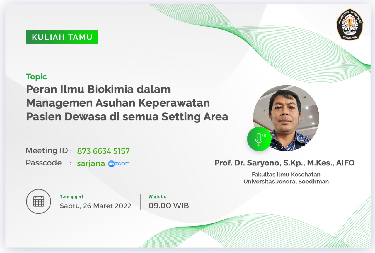 Semarang – The Bachelor of Nursing Study Program of the Department of Nursing, Faculty of Medicine, Undip will organize a guest lecture on 26 March 2022 at 09.00 a.m. via Zoom media.